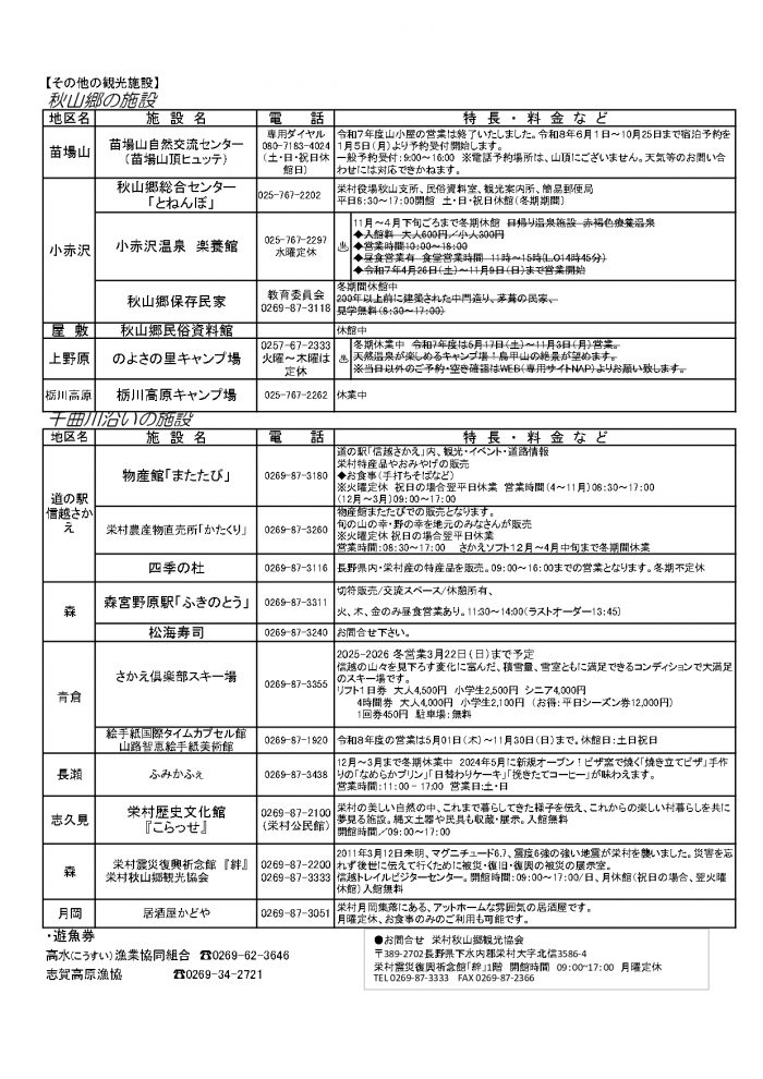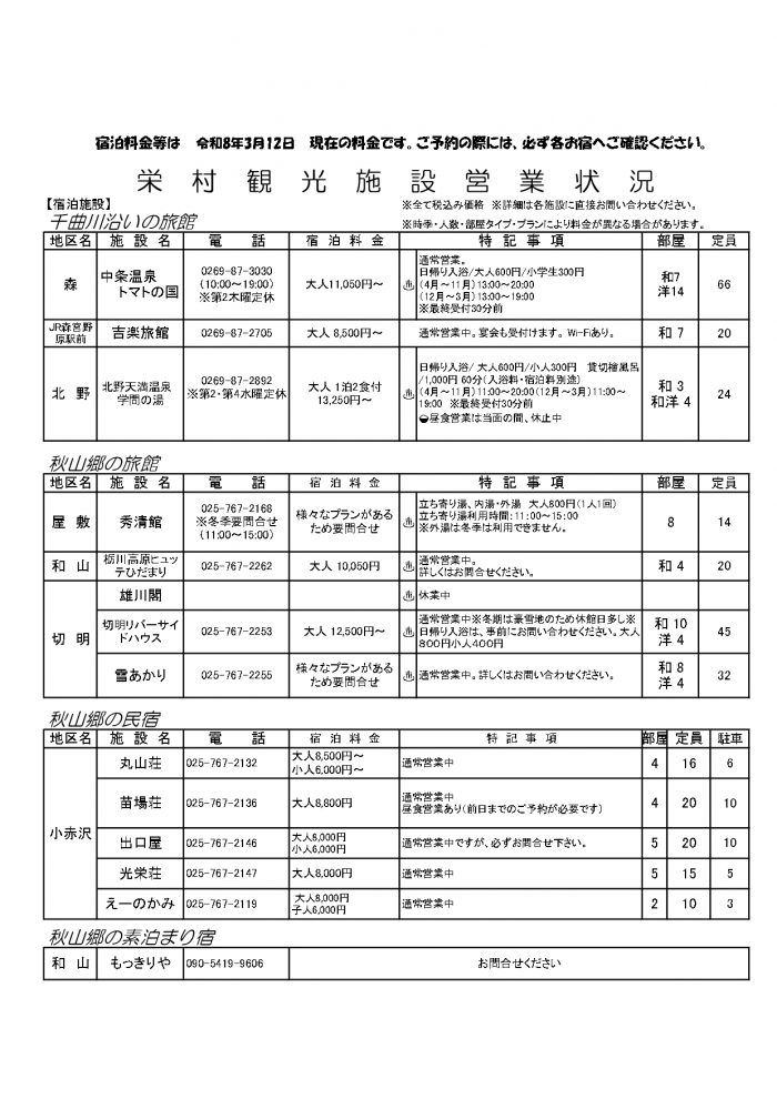 村内施設営業状況(2026/3/12現在)
