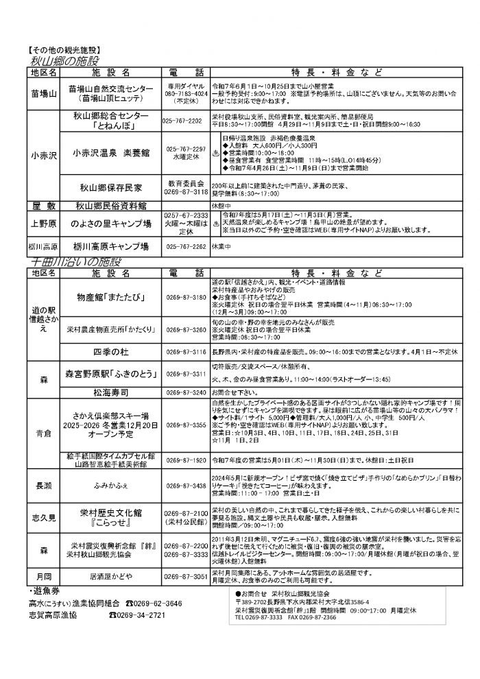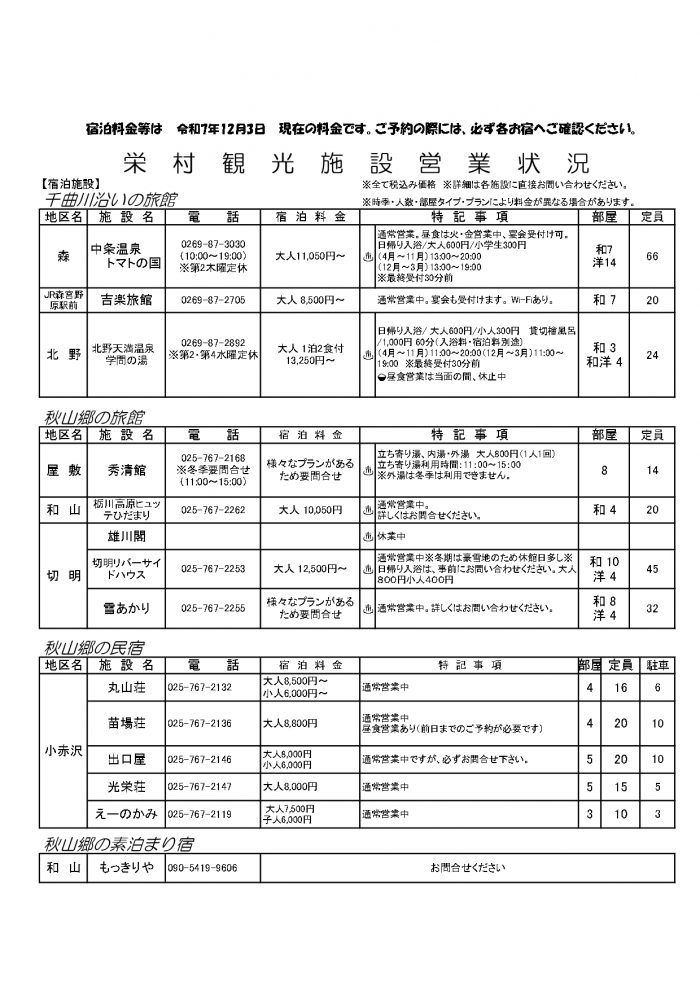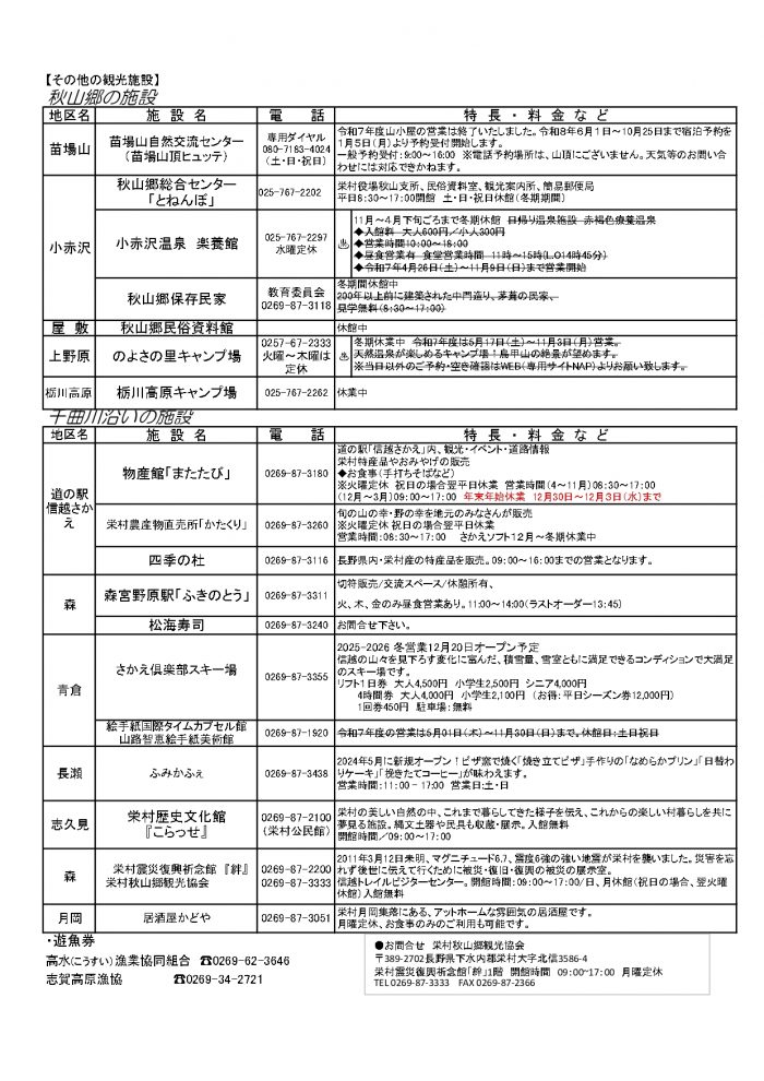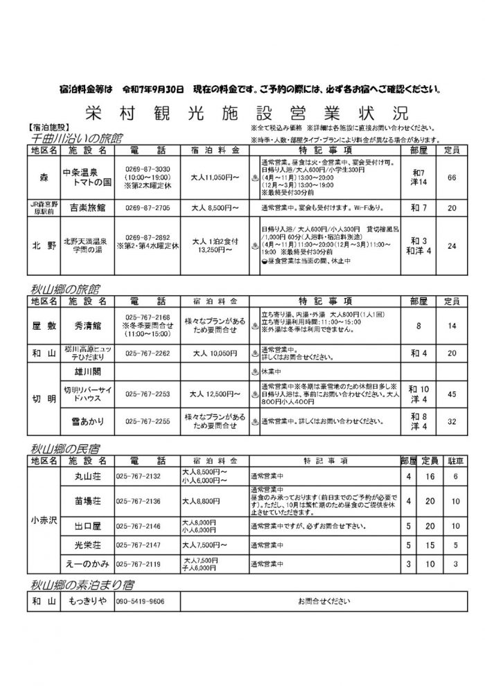 村内施設営業状況(2025/9/30現在)