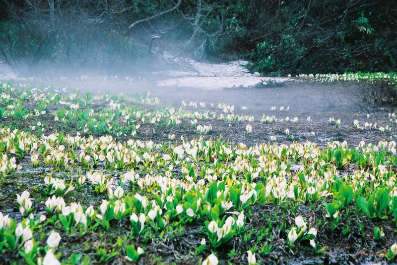 山頂付近の600ヘクタールに及ぶ大湿原には、大小無数の池塘が水をたたえ、コバイケイソウ、チングルマ、ワタスゲ、ドウダンツツジ、ヒメシャクナゲなどの美しい高山植物が群生しています。