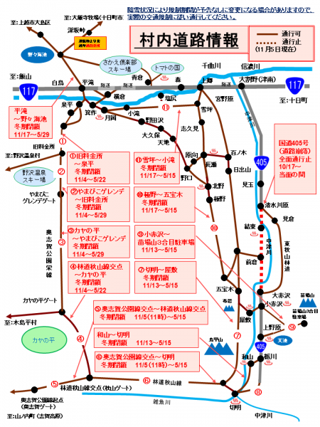 本日11月05日(水)11:00より、奥志賀公園栄線および林道秋山線が通行止めとなります。